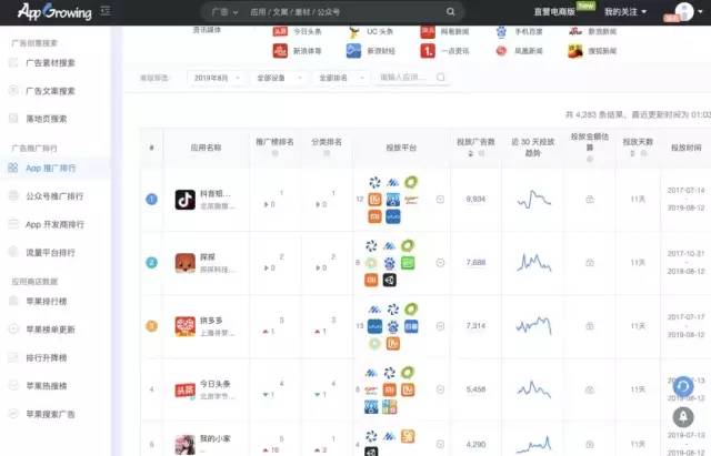 App Growing:先进的广告情报监测平台,可查看国内热门行业的线上广告数据,包括广告创意搜索、广告推广排行、iOS 应用商店数据。不仅能查看全平台广告的落地页、文案、投放数量变化,还能够预估广告投放金额。另外,还有专门的二类电商爆款监测功能。