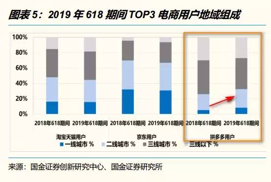 此外,根据券商报告,从2018年618到2019年618期间,拼多多一二线城市用户比例提升明显。拼多多也表示,在今年618期间,70%的农产品订单来自一二线。