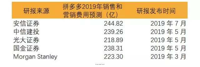 根据多家券商研报,拼多多2019年的营销费用大约在220亿至250亿之间。我们结合各家平均值,以232亿人民币作为拼多多2019年营销费用的市场预期。
