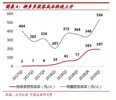 结合多家券商的分析报告来看,拼多多的获客成本在从2018年开始快速飙升。