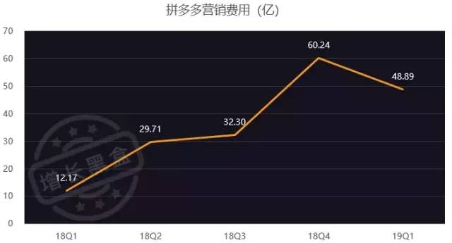 然而,到2018年,情况变得不同了。拼多多财报公布的营销费用从2018Q3的32亿人民币,上涨到Q4的60亿人民币,营销费用几乎翻倍,而在2019Q1也依然保持着48亿人民币的高位。