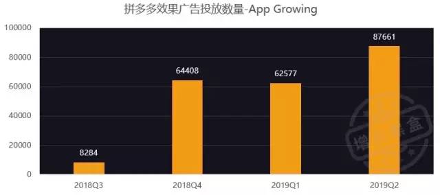 从App Growing的数据来看,拼多多在18年第四季度才开始密集投放在线广告。单看投放数量的话,拼多多仅在2019年前两季度的广告数量,就已超过去年全年投放量。