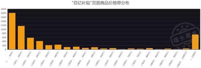 另外,从“百亿补贴”商品的价格带来看,符合“价格越低,数量越多”的分布。尽管拼多多一直以低价著称,但此次活动中也没有轻视高价商品——1000元以上的商品在活动所有SKU中的比例超过12%。(大部分都是电子产品,似乎是在和京东抢生意)