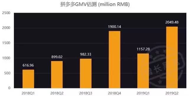 拼多多的季度GMV数据由“超对称”团队提供,他们通过监测拼多多App前端商品数据的变化来预测GMV,超对称预测拼多多2019Q2的GMV在2049亿人民币。