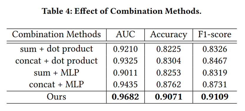 表4总结了不同组合方法的实验结果,验证了相比之下本文的组合方法最优。此外,求和设置的性能弱于串联设置。一个可能的原因是,两个特征表示有异构性,它们属于不同的语义空间。