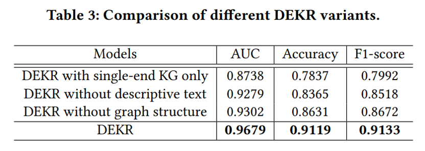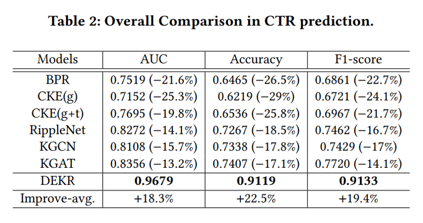 DEKR在CTR预测任务上的表现优于所有baseline模型,平均提高了15%以上。此外,DEKR在top-𝐾 任务上也表现出色。同时几乎所有基于知识图谱的模型都在推荐任务上优于传统模型,这表明在知识图谱中引入丰富的关系和信息极大地提高了推荐的有效性。