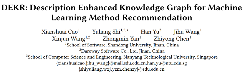 1.构造了一个描述增强的机器学习知识图谱,它不仅考虑了机器学习实体之间的丰富联系,还考虑了查询实体(即数据集和方法)的描述信息;2.提出了DEKR模型,该模型结合了基于知识图谱和基于文本的方法,克服了传统的基于知识图谱的方法忽略实体描述信息的局限性;