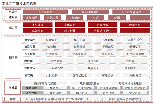 技术架构:在政策规划支撑下,工业元宇宙的技术架构链条逻辑上分为基础层、技术层、能力层、终端层、应用层五大板块。其中核心技术层涉及多类技术群的融合和创新并集成于平台,实现工业相关领域深度赋能。