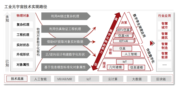 其中,智能网络、大数据、人工智能、云计算、区块链等相关基础技术是工业元宇宙的技术底座;感知互联、实体映射、多维建模、时空计算、仿真推演、可视化、虚实交互七个数字孪生相关技术构成了工业元宇宙的关键技术体系。