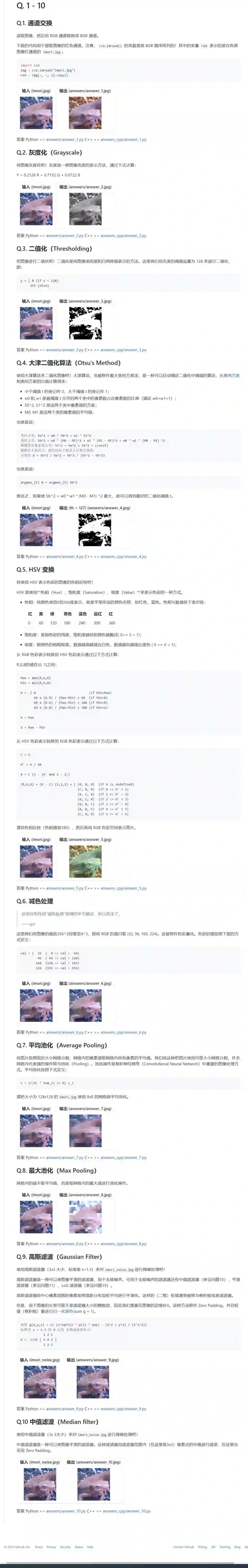本文整理了图像处理初学者应该需要了解的100个基础问题,涉及读取、显示图像、操作像素、拷贝图像、保存图像、灰度化(Grayscale)、二值化(Thresholding)、大津算法、HSV 变换、减色处理、平均池化(Average Pooling)、最大池化(Max Pooling)、高斯滤波(Gaussian Filter)、中值滤波(Median filter)、仿射变换(Afine Transformations)等100多个知识点。