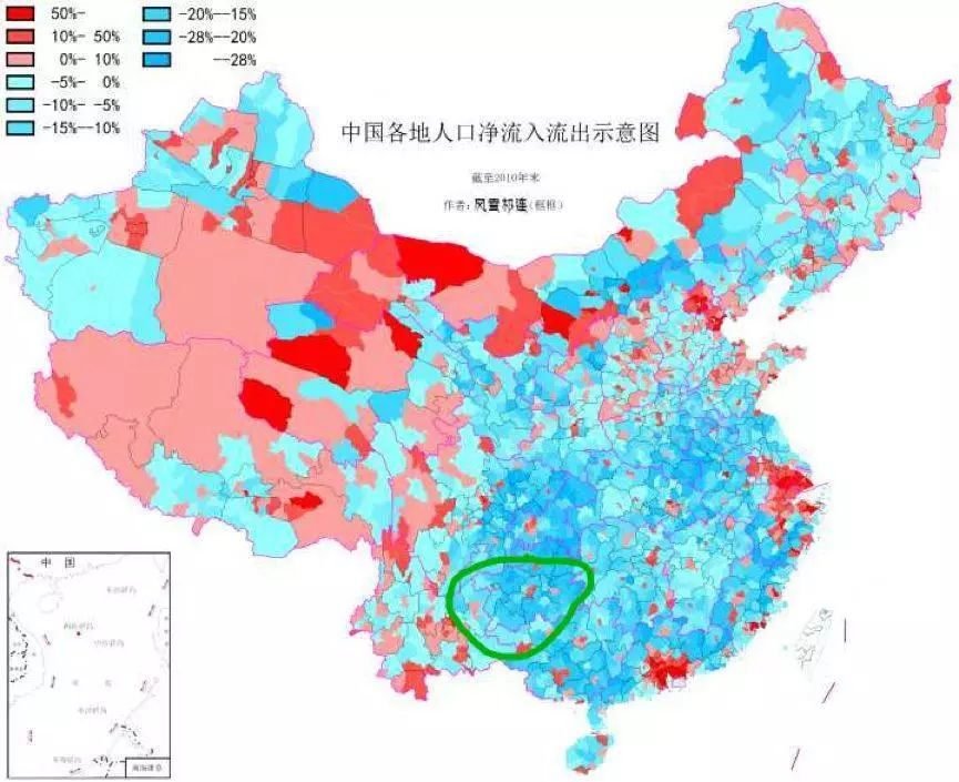 *绿色框住部分为贵州大致区域。红色为流入,蓝色为流出,深色为流入流出率高,淡色为流入流出率低。