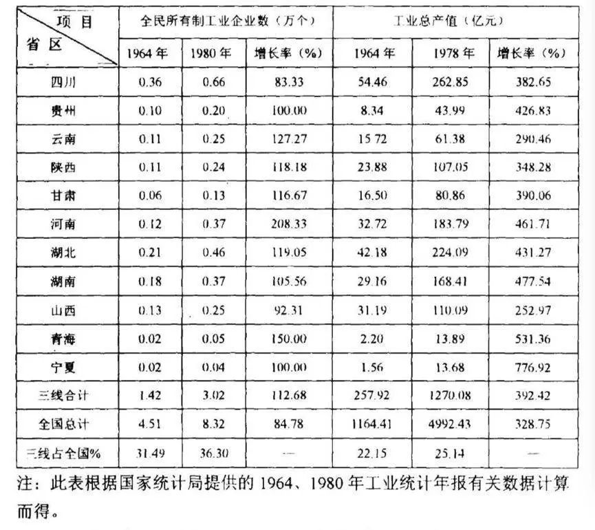 所谓三线建设,是按我国地理区域划分的,沿海地区为一线,中部地区为二线,西南和西北地区为三线。总的来说,彼时工厂大多集中于大城市和沿海地区,要把他们统统搬到靠山、隐蔽的三线去。在当时的领导人看来,加强后方建设可以增强战备力量,即使敌人不进来,也可以当作建设内地的长远考虑。