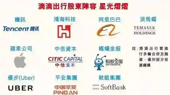 除了Uber,内地三大科网巨头‘BAT’百度、阿里巴巴、腾讯,以至活跃于风险投资的软银、鸿海和平安均是滴滴股东,尤见特别的是,美国苹果公司也在2016年入股10亿美元,为苹果在华最大单一科网投资。