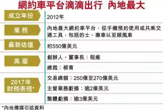 财务表现方面,内地传媒早前报道,滴滴去年交易总额介乎250亿至270亿美元,惟主要业务亏损逾2亿美元亏损,整体亏损超过3亿美元。