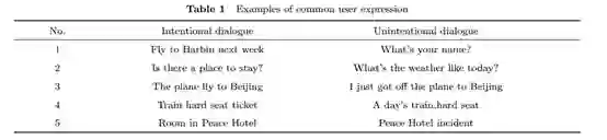 对于表1中前两组例子,直观上看,有出行意图和无出行意图的文本表达在用词、句式上存在较大的差异,可以直接使用一些模板匹配的方式进行识别。但是在聊天语料中处理过程中发现,由于聊天系统对话的特殊性,用户的表达一般较短,一些无意图的用户聊天文本在用词,句式上和有意图文本比较接近,通过一些模板或者关键词特征的方法不容易区分。 从表1中的第3到第5组例子可以看出,每一组的两句对话在用词或者句式上都具有很高的相似性,但却属于两类不同的意图领域。 对于第3组例子,尽管二者都具有相同的“动词+地点”的动宾关系句法结构,并且都包含了“飞机”这一关键词,但是有意图文本希望查询到某地的航班信息,而无意图文本则是表达了用户刚刚下飞机;对于第4组例子,有意图对话表达想去北京要订火车票,而无意图表达只是表示自己坐了一天的火车;对于第5组例子,有意图文本很短,只有三个词语,但是却包含了“酒店”,“大床房”等关键词,无意图文本虽然也包含了关键词,但是表达的却是一个新闻事件,并不是希望订酒店。