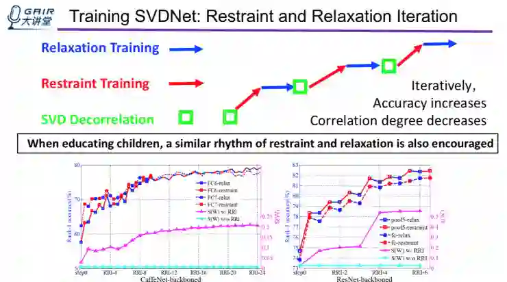 有了SVD去相关过程后,额外设计了一个训练步骤,叫做张弛迭代法。在紧张训练时,性能表现提升,在松弛训练阶段下性能不变,甚至略微降低。但总体的趋势是上升。
