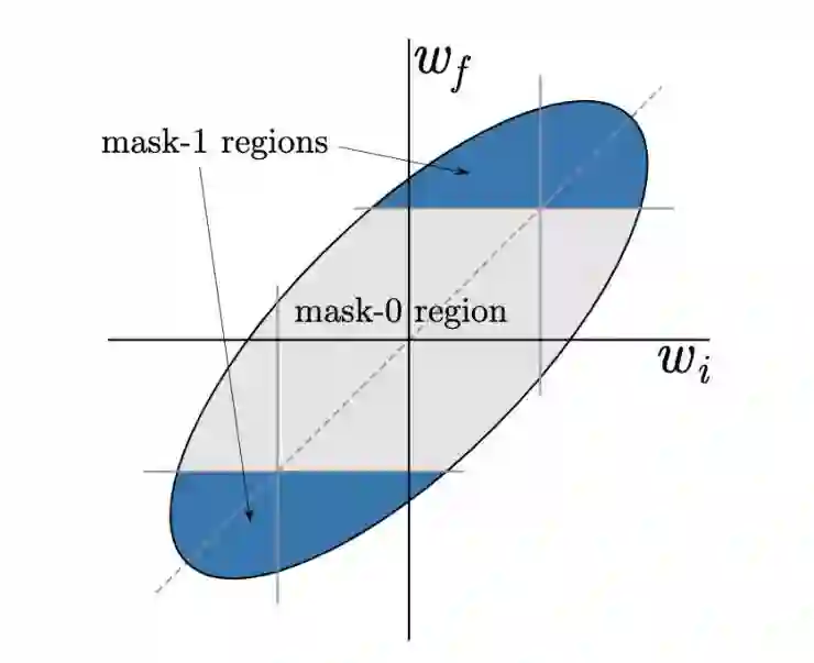 图 5:不同的掩模标准可以被认为是将(wi,wf)空间分割成与掩模值「1」或「0」相对应的区域。椭圆以动画的形式表示出某给定层的正相关的初始值和最终权重占据的区域。图中的掩模对应于LT论文中使用的「large final」标准:保持具有大的最终值的权重,并且对具有接近零的最终值的权重进行剪枝。请注意,此标准忽略了权重的初始值。