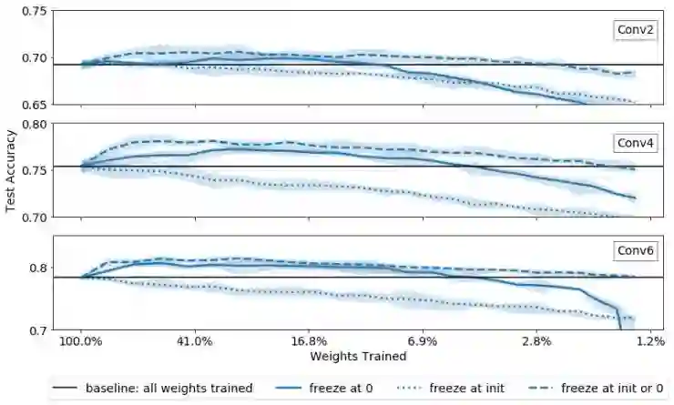 图2:当在 CIFAR-10 数据集上测试上述的三个卷积神经网络时,我们发现具有被冻结为其初始值的剪枝后权重的网络的准确率比具有被设置为零的剪枝后权重的网络的准确率明显要低一些。