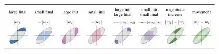 图 6:从 LT 论文中出现的「large final」标准开始,从左到右依次为本研究中考虑的八个掩模标准。我们给出了用来指代各种方法的名称以及将每个(wi,wf)对投影到一个分数上的公式。我们保留具有最高分数(彩色区域)的权重,并且对具有最小分数(灰色区域)的权重进行剪枝。