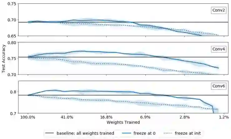 为了分开上述两个因素,我们进行了一个简单的实验:我们复现了 LT 迭代剪枝实验,其中网络权重在交替的「训练/掩模/重置」的循环中被掩模处理,但我们还尝试了其它的处理方式:将「零掩模」处理的权重冻结为其初始值,而不是将其冻结为零。如果零不是特殊的,那么这两种方法得到的性能应该相似。我们遵循 Frankle 和 Carbin(2019)的做法,在 CIFAR-10 数据集上训练三个卷积神经网络(CNN),Conv2,Conv4 和 Conv6(具有 2/4/6 卷积层的小型 CNN,这与 LT 论文中使用的相同)。