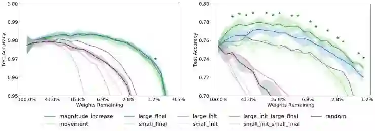 图 7:两个网络的准确率与剪枝百分比的测量结果,MNIST 数据集上的全连接网络(左图)和 CIFAR-10 数据集上的 Conv4 网络(右图)。表明多个掩模标准——「large final」,「magnitude increase」,以及另外两个标准,确实优于黑色的随机剪枝基线。在Conv4网络中,「magnitude increase」的性能提升大于其他掩模标准; 星号标记出了「large final」和「magnitude increase」之间的差异在 p = 0.05 的水平上具有统计显着性的情况。