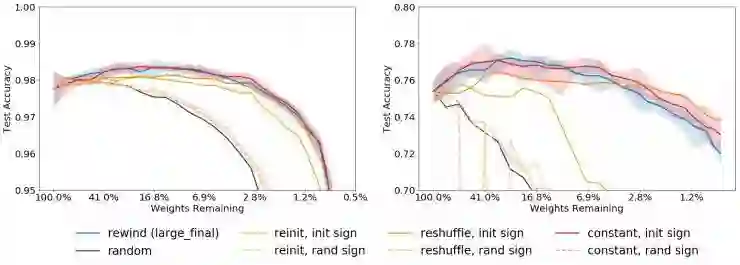 其次,除了这些让人眼前一亮的结果,剩余网络的结构和权重的特征同样有趣。通常情况下,如果你使用经过训练的网络,通过随机权重对其重新进行初始化,然后重新训练它,其性能将与之前大致相当。但是对于精简的骨架彩票(LT)网络来说,这个特性并不成立。只有当网络重新回到其初始状态时(包括使用的特定初始权重),网络才能很好地训练。用新的权重重新初始化会导致训练效果不佳。正如 Frankle 和 Carbin 的研究所指出的那样,剪枝掩模的特定组合(对于每个权重来说,显示是否删除该权重的 0-1 值)和掩模之下的权重构成了一个在更大的网路中找出的幸运子网络。或者正如最初的研究中所命名的那样,这是一个通往胜利的「彩票」模型。