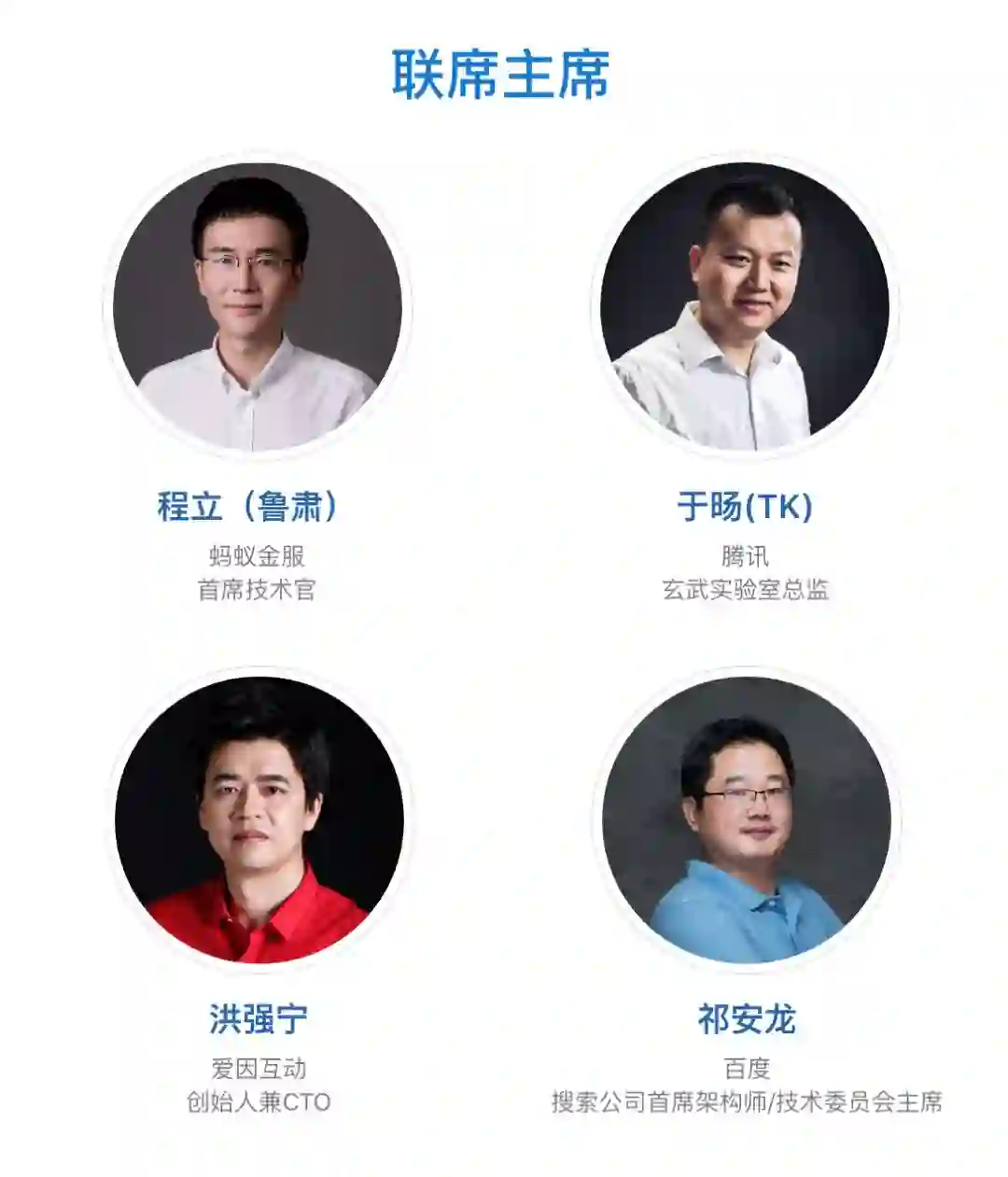 目前已确认蚂蚁金服首席技术官程立(鲁肃)、腾讯玄武实验室总监于旸 (TK)、百度搜索公司首席架构师 / 技术委员会主席祁安龙、爱因互动创始人兼 CTO 洪强宁担任联系主席为内容质量把关,阿里巴巴集团合伙人,蚂蚁金服集团副 CTO 胡喜将贡献主题演讲,更多技术大咖正在陆续确认中。