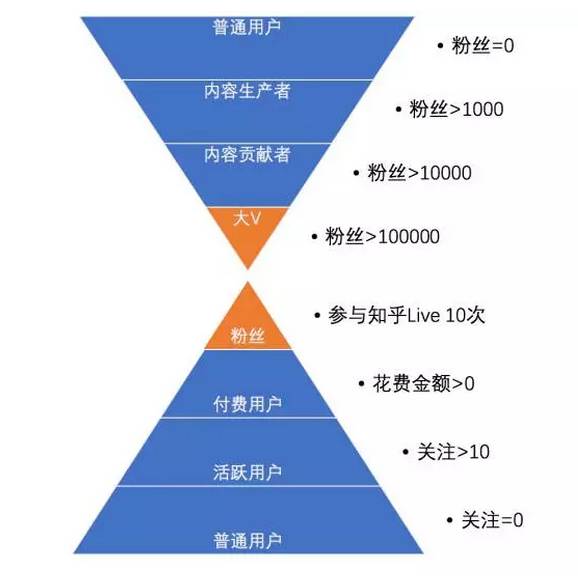 接下来,我们想一下知乎的用户分层是什么样的形式?它的核心是大V生产内容?还是更多用户参与Live获得营收?挺难决断的,其实很多运营体系,用户分层是两层结构。