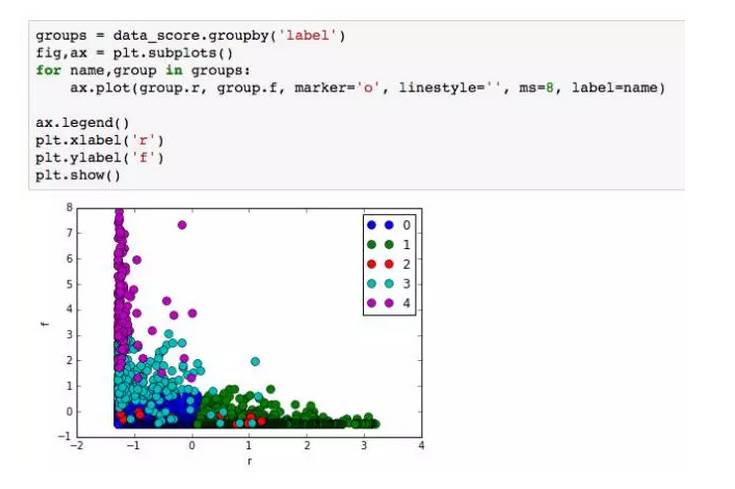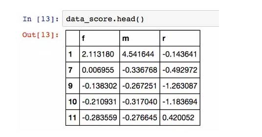 上图的三列数据是经过标准化后的用户消费数据。值越接近0,说明离平均水平越近。r值因为是最近一次消费时间,所以值越小,说明时间越接近,值越大,说明消费越久远。