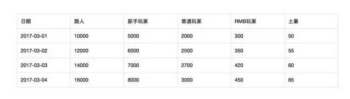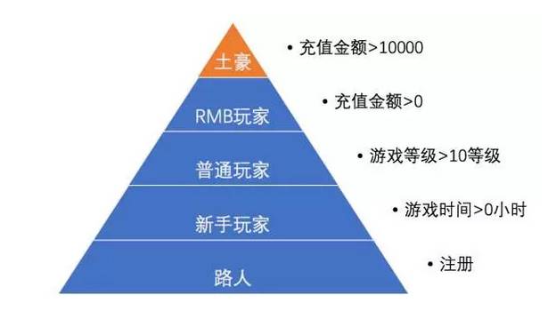 上图是一个简化的游戏用户分层,每层指标都是可量化的。为了上下层用户清晰,群体间应尽量独立,即计算RMB玩家时,应该把土豪玩家排除,计算普通玩家时,应该把结果中包含的上两层排除,这样运营的针对性才强。