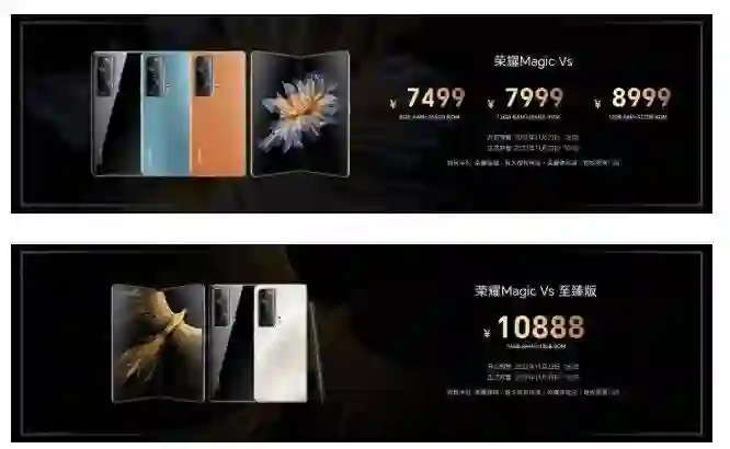 【荣耀发布新一代折叠屏荣耀Magic Vs系列】11月23日,荣耀发布新品折叠屏Magic Vs系列,7499元起售。屏幕展开为7.9英寸,支持90Hz刷新率。采用自研“鲁班0齿轮铰链”,最轻轻至261g,电池容量达到5000mAh,为目前市售内折叠屏手机电池容量最高。后摄为5400万像素三摄,配置Flicker传感器。(搜狐科技)