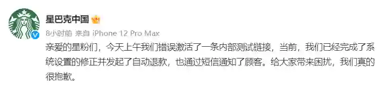 【星巴克中国就抖音0.01元咖啡券无法兑换致歉】11月23日,多位消费者反映,自己在星巴克抖音官方账号上成功抢购到0.01元星巴克馥芮白大杯双倍券,但随后却收到短信通知,提示发券失败,系统也显示已自动退款。对此,星巴克中国回应称,“今天上午我们错误激活了一条内部测试链接,当前,我们已经完成了系统设置的修正并发起了自动退款,也通过短信通知了顾客。给大家带来困扰,我们真的很抱歉。”(中新经纬)