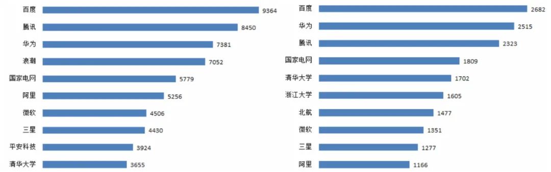 图左:中国人工智能专利申请数量排名;图右:中国人工智能专利授权数量排名。