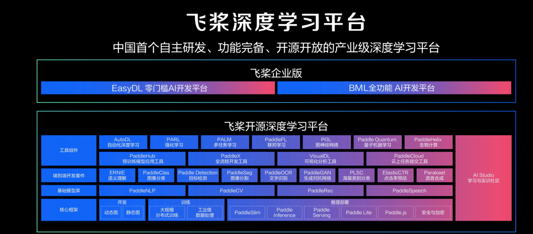 今年,国产深度学习框架迎来了开源的「春天」,来自各高校和企业的框架、平台先后开源,正在形成一股合力,推动着中国开源的车轮不断前进。飞桨是百度自研、中国首个开源开放、功能完备、完全自主可控的产业级深度学习平台,也是深度学习开源框架中最知名的「中国品牌」。