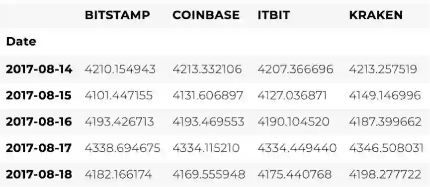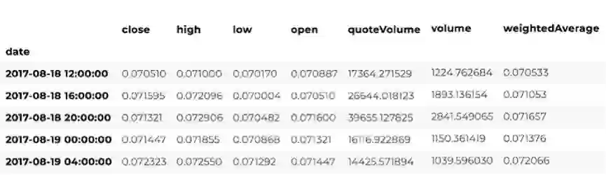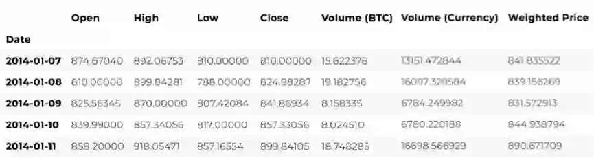 现在,我们有了包含9个数据框的字典,每种都包含山寨币与比特币之间的历史日平均价格数据。