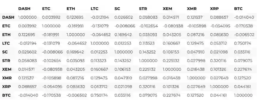 例如,从上图中可以很明显看出XRP(Ripple的代币)是与其他电子货币相关性最低的。但这里有一个值得注意的例外是STR(Stellar的代币,官方名字是"Lumens"),与XRP有强相关关系(相关系数:0.62)。