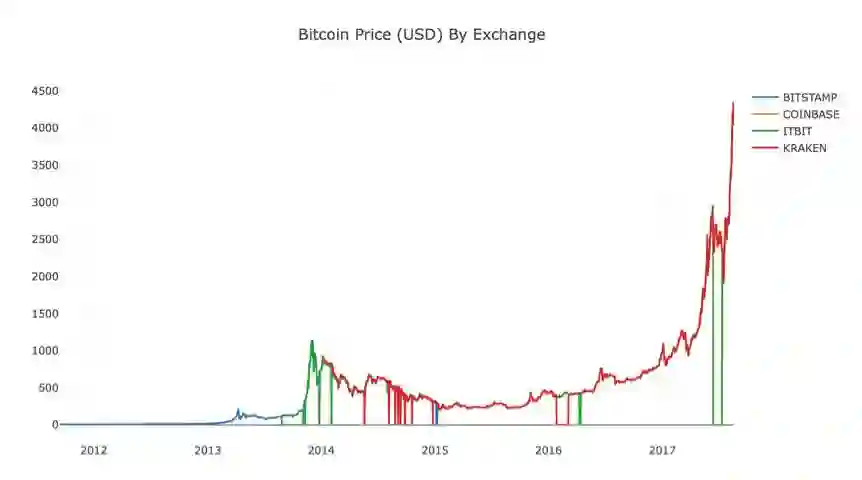 你可能已经注意到,上面的数据集中存在数据缺失现象--特别是在2014年末和2016年初。在Kraken交易所的数据集中,这种数据缺失情况尤为明显。我们当然不希望这些数据会影响到我们对价格的全面分析。