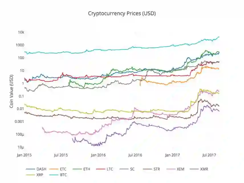 你可能注意到电子货币的汇率看上去似乎是相关的,尽管他们的货币价值相差很大,而且波动性很高。尤其是从2017年4月的迅猛上涨开始,甚至很多的小波动似乎都与整个市场的波动同步出现。