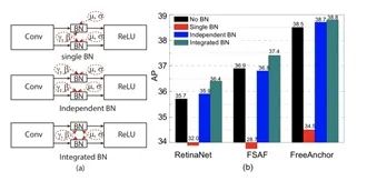 既然有了尺度空间的卷积,我们自然的想到了空间尺度共享所有参数的批归一化(iBN),我们每一次Pconv后,我们将所有层连接在一起,共同更新统计量,这一设计较NAS-FPN[2]中使用的各尺度用各自的BN参数具有更优的性能且更易工程化(如推理时去除BN)。