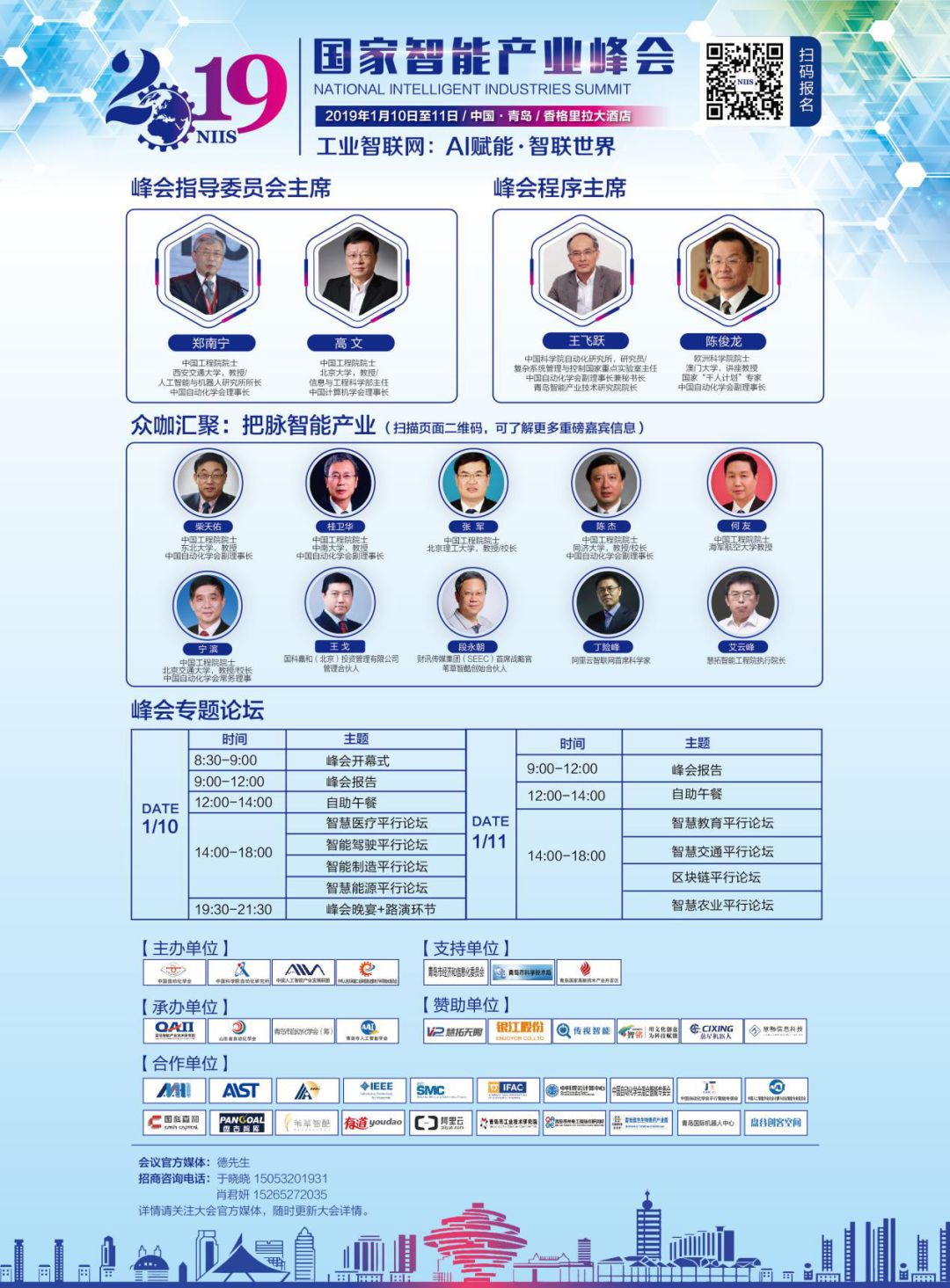 由中国自动化学会理事长郑南宁院士、中国计算机学会理事长高文院士共同担任指导委员会主席,中国自动化学会副理事长兼秘书长、中科院自动化研究所研究员王飞跃与中国自动化学会副理事长、澳门大学讲座教授、欧洲科学院院士陈俊龙共同担任峰会程序主席的2019国家智能产业峰会将于2019年1月10日至11日在青岛举行。峰会广邀从事深度研究的科技专家、洞察行业发展趋势的产业大咖、助力科技创新的金融机构,论道智能产业发展趋势,共话智能产业未来!无论是在会议议题、嘉宾阵容还是会议规模上,本次峰会都堪称国内顶级的智能产业盛会。