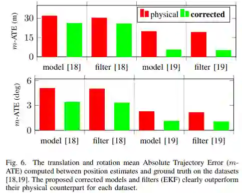 图6 在[18, 19]数据集中,physical和corrected模型的平移和旋转的平均绝对轨迹误差。提出的corrected模型和EKF滤波明显比physical模型好。