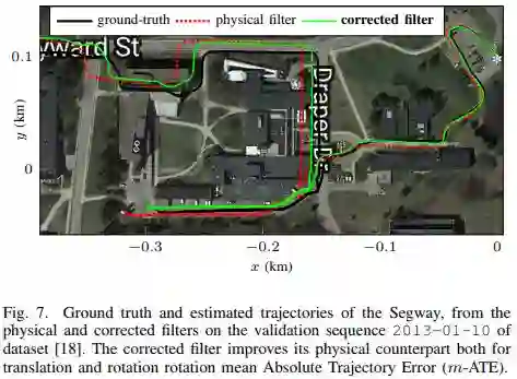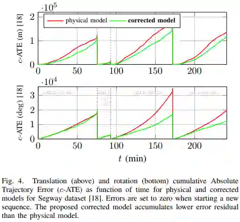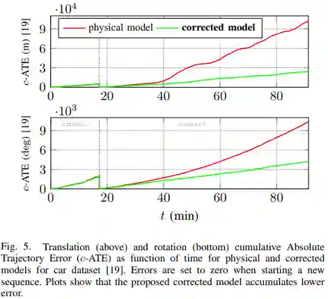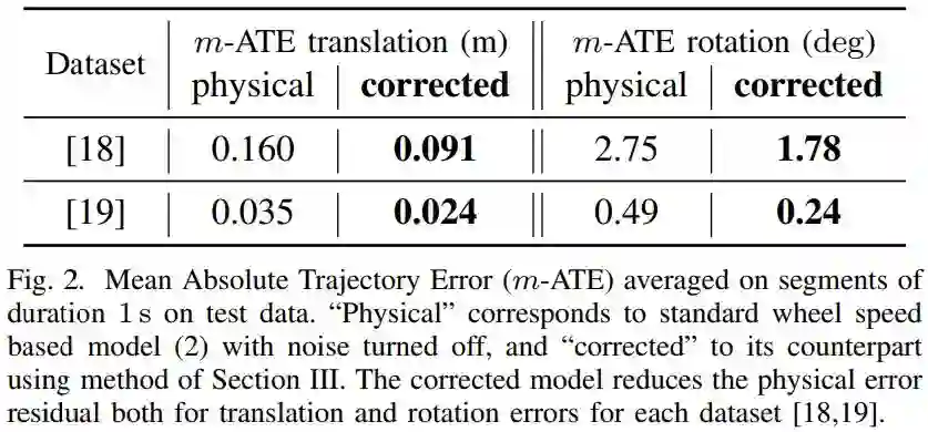 图2 测试数据上持续时间为1 s的段的平均绝对轨迹误差(m-ATE)。“Physical”对应无噪声的标准轮速运动模模型, “corrected”对应是在本文第三节中提出的方法。在[18,19]每个数据集中,corrected模型减少了physical模型的平移和旋转的误差残差。
