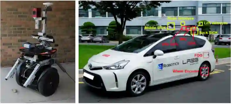 图1 左[18]右[19]两图分别为用于采集数据的配备了两个轮式编码器,光纤陀螺仪和消费级IMU的载体车。