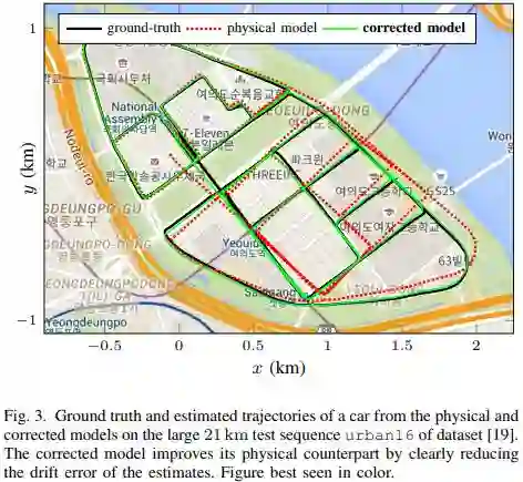 图3 在[19]的urban16数据集中的21 km的大型测试序列中,真实轨迹与physical和corrected模型的估计的轨迹。