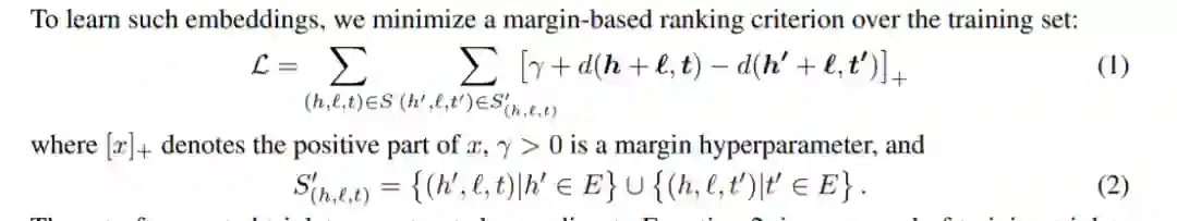 TransE 定义了一个距离函数 d(h + r, t)来衡量 h + r 和 t 之间的距离,我们也可以使用 L1 或 L2 范数。TransE采用最大间隔的方法,其目标函数如下:
