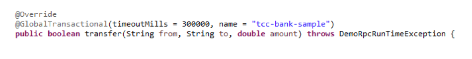 @GlobalTransactional(timeoutMills = 300000, name = "tcc-bank-sample")