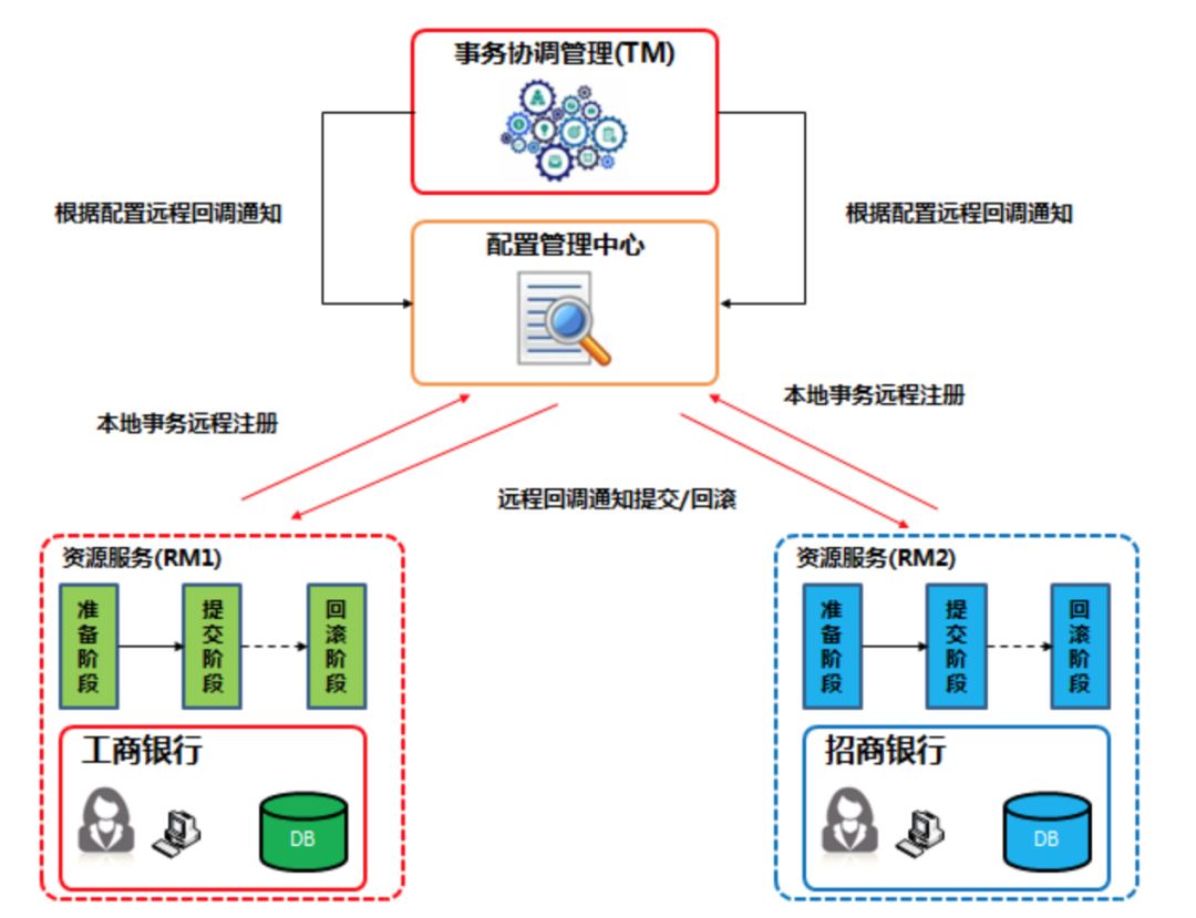 SEATA就是事务管理中心,Transaction Management,简称TM。各个Dubbo微服务会被当成一种Resource被注册进SEATA的“资源管理器”,我们简称RM。