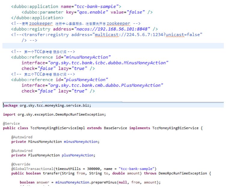 boolean answer = tccMoneyKingBizService.transfer(acctFrom.getAccountId(), acctTo.getAccountId(),
