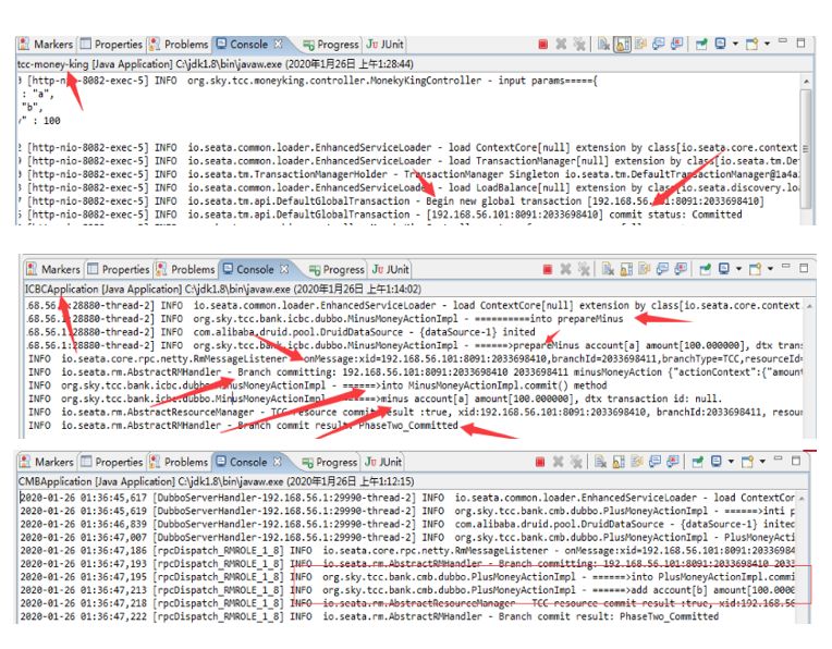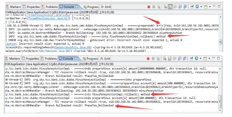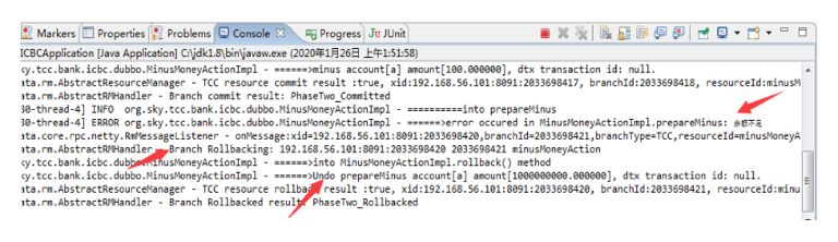 这边可以看到是如何调用icbc的扣款和cmb的打款动作的,这边根本不需要你再去写什么commit和rollback,只要这两个dubbo provider中的prepare方法执行正常,SEATA就会自动回调icbc和cmb中的commit方法;只要icbc或者是cmb中有任何一步抛错,就会触发这两个provider中的业务回滚rollback方法。