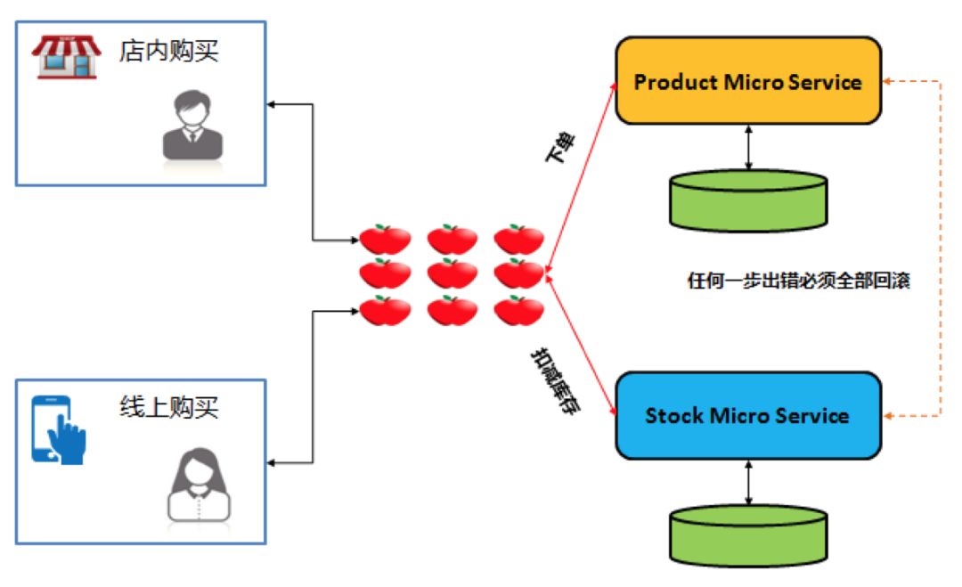 从上例我们可以看到,当商品主数据与库存主数据被折开来后,就会发生一个数据一致性的问题。假设你在后台对商品主数据做了一个添加或者是更新的动作那么整个系统也要求相应的库存数据与主数据必须一致,而一旦你拆成了微服务后主数据与库存说白了其实已经变成了两个不同的系统,每个系统都有自己的独立DB。这时要解决的就是这2个系统间任何的一个更新操作失败后为了维护数据的一致性那么这两个相关的“服务”都需要回滚之前的操作。